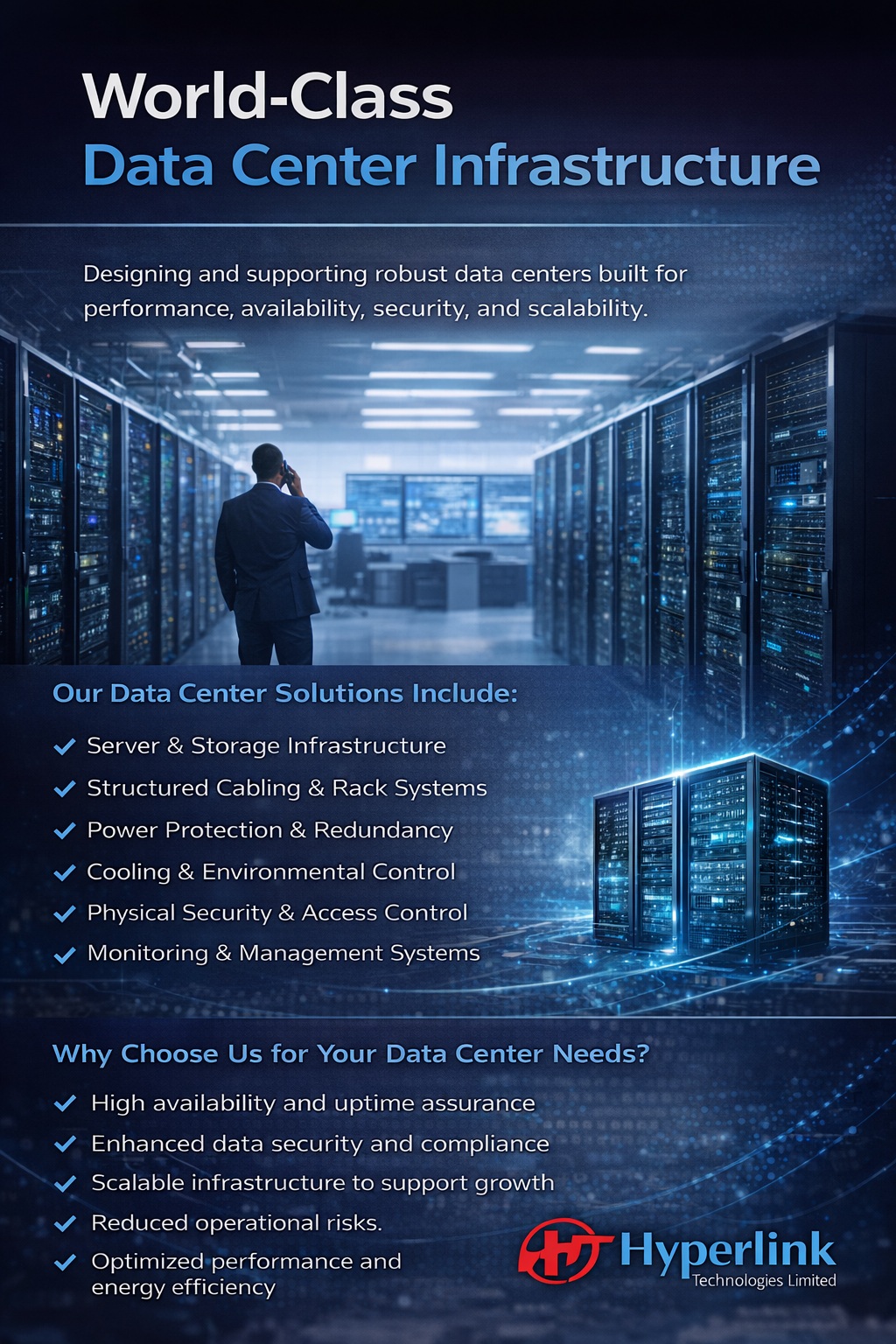 At Hyperlink Technologies Limited, we design, deploy, and support world-class data center infrastructures built for performance, availability, and scalability. Our solutions are tailored to meet the operational demands of corporate and public sector organizations while aligning with international best practices.